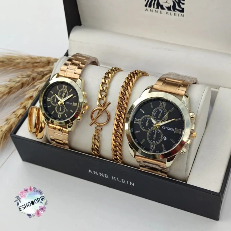 ساعت مردانه و ساعت زنانه ست با دستبند و انگشتر طلایی برند رومانسون