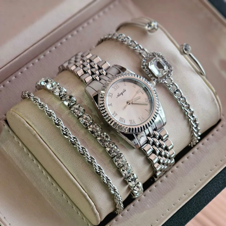 ست ساعت مچی زنانه استیل با دستبند نقره ای 5 تیکه