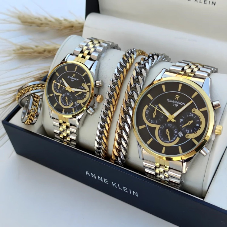 ست ساعت زنانه و مردانه رومانسون vip با دستبند و حلقه طلایی نقره ای با ارسال رایگان