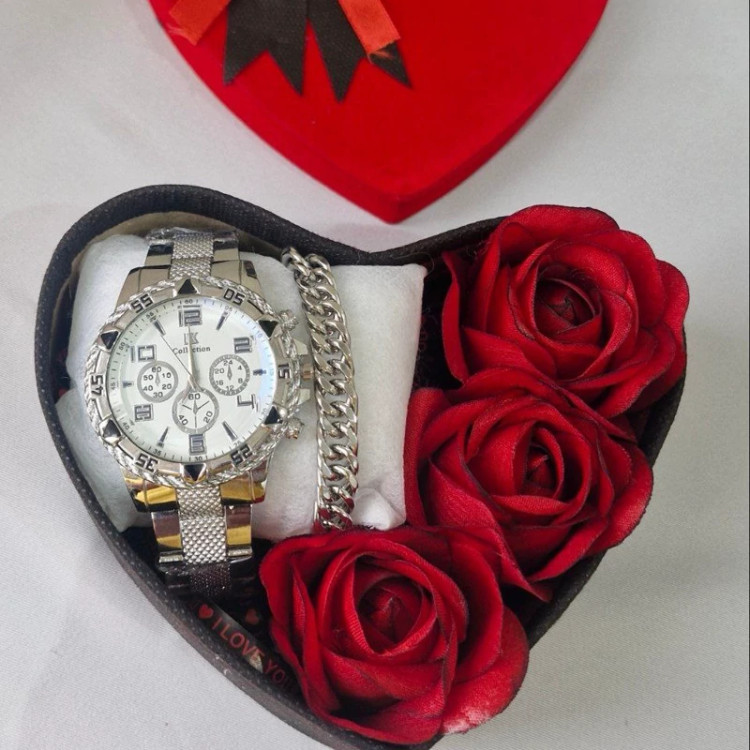 پک کادویی مردونه ساعت و دستبند با جعبه هدیه و گل