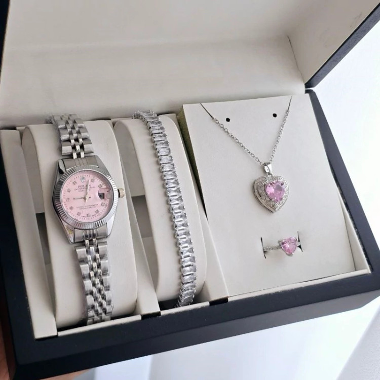 ساعت مچی دخترانه رولکس صورتی با دستبند و گردنبند انگشتر