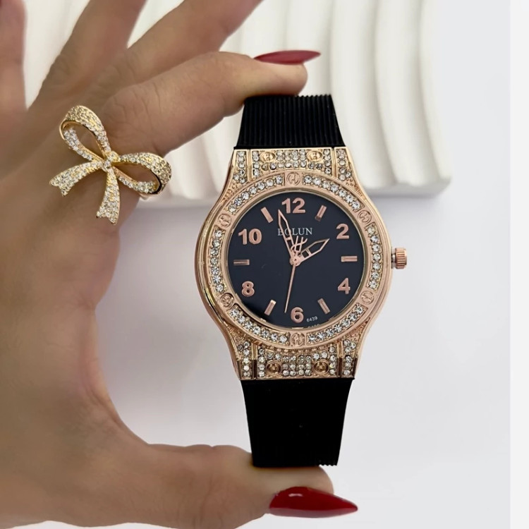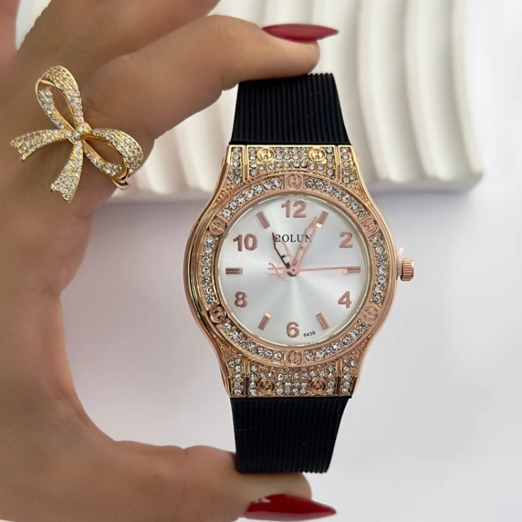 ساعت مچی زنانه دخترانه طرح هابلوت با قاب دور نگین و بند پیو سیلیکونی مشکی