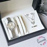 ست ساعت زنانه با دستبند و نیم ست گوشواره و گردنبند و انگشتر نقره ای طرح قلب رنگ ثابت