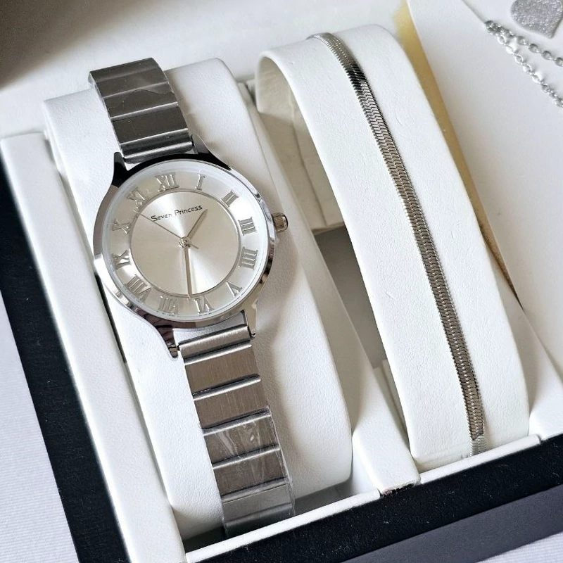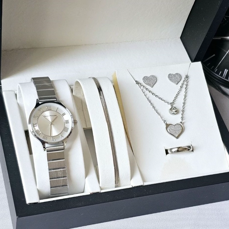 ست ساعت زنانه با دستبند و نیم ست گوشواره و گردنبند و انگشتر نقره ای طرح قلب رنگ ثابت