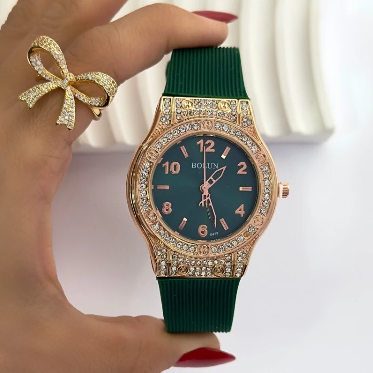 ساعت مچی زنانه دخترانه طرح هابلوت با قاب دور نگین و بند پیو سیلیکونی سبز