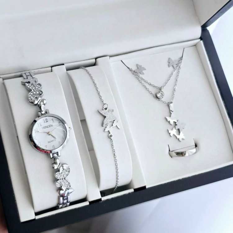 ست ساعت دخترانه با دستبند و نیم ست پروانه نقره ای
