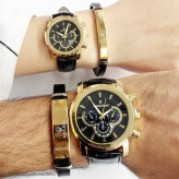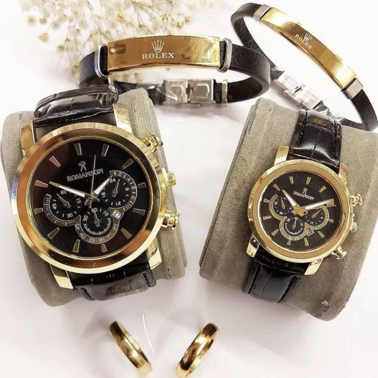این ست دارای ۶ تیکه می باشد که شامل دو ساعت مردونه و زنونه با بند چرم با کیفیت از برند رومانسون ، دو دستبند چرم و دو حلقه یا رینگ طلایی می باشد