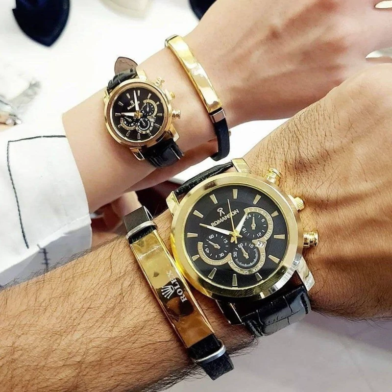 این ست دارای ۶ تیکه می باشد که شامل دو ساعت مردونه و زنونه با بند چرم با کیفیت از برند رومانسون ، دو دستبند چرم و دو حلقه یا رینگ طلایی می باشد