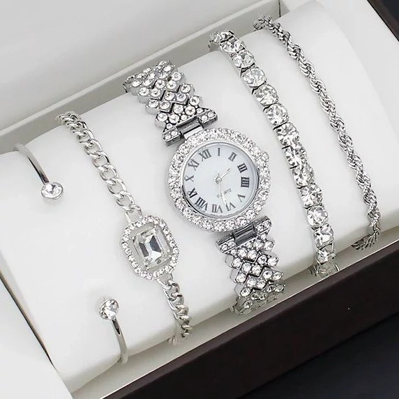 ⌚️⌚️ ساعت مچی زنانه نقره ای با بند دستبندی نگین دار و قاب و صفحه دور نگین همراه با 4 عدد دستبند طلایی