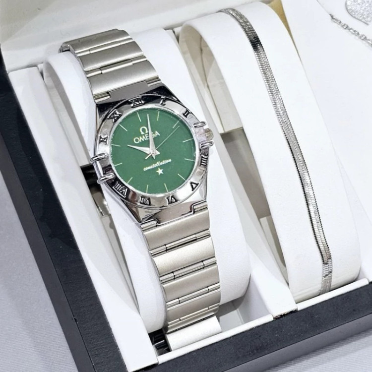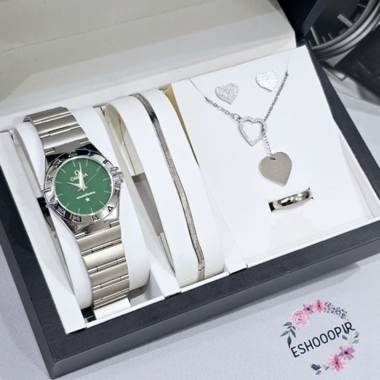 ساعت زنانه ست با دستبند و نیم ست گوشواره و گردنبند و حلقه استیل نقره ای رنگ ثابت