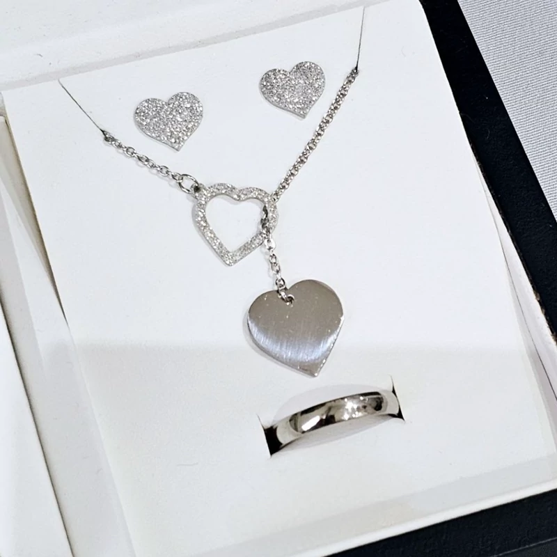 ساعت زنانه ست با دستبند و نیم ست گوشواره و گردنبند و حلقه استیل نقره ای رنگ ثابت