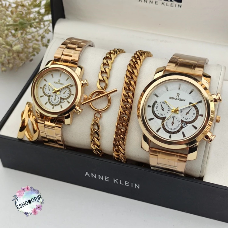 ساعت زنانه و مردانه ست طلایی با دستبند و انگشتر برند رومانسون و ارسال رایگان