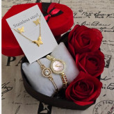 باکس هدیه زنانه ساعت و دستبند و نیم ست استیل طلایی با جعبه کادویی و گل