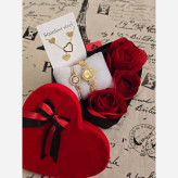 🎁 پک هدیه زنانه شامل ساعت مچی زنانه طلایی و دستبند و نیم ست استیل طلایی با باکس قلبی کادویی و گل رز و پوشال
