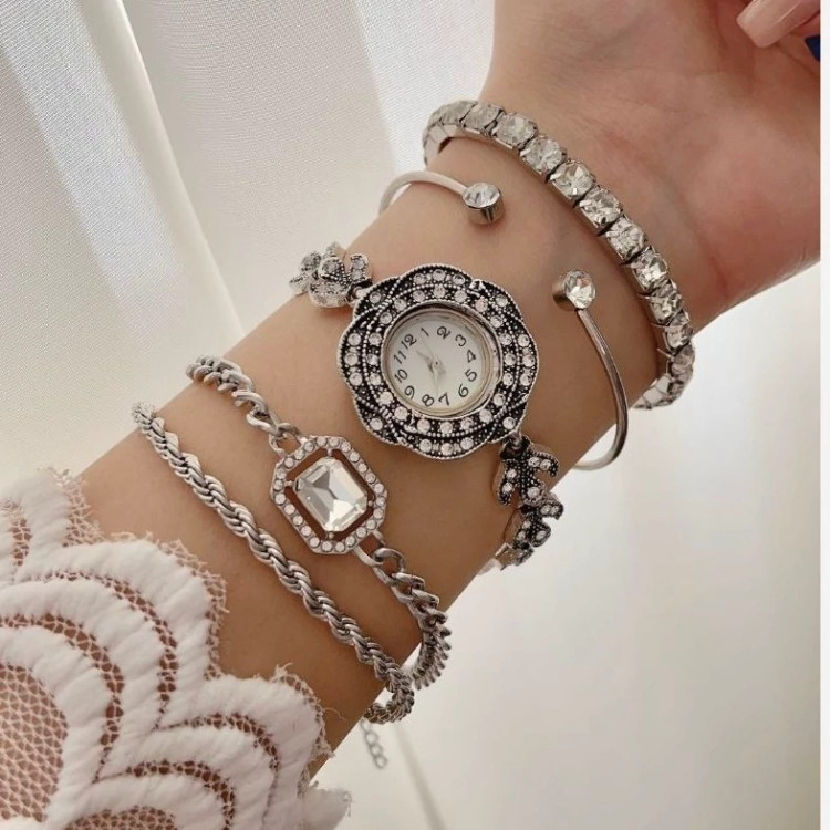 ساعت مچی زنانه طرح نقره با بند دستبندی و صفحه دور نگین همراه با 4 عدد دستبند نقره ای