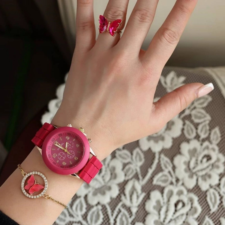 ساعت دخترانه با دستنبد و انگشتر پروانه صورتی سرخابی