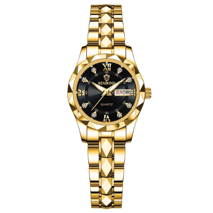 ساعت مچی زنانه اورجینال دو تقویم فول استیل رنگ ثابت و ضد اب بینبند دارای رنگبندی BINBOND طلایی