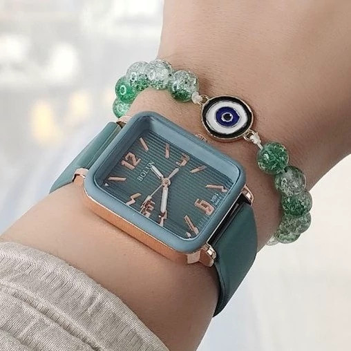 ست ساعت دخترانه مستطیل آبی کله غازی با دستبند مهره ای