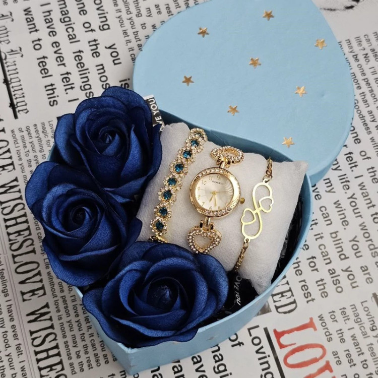 🎁 پک هدیه زنانه شامل ساعت مچی زنانه طلایی و دو دستبند همراه با باکس قلبی کادویی و گل رز و پوشال