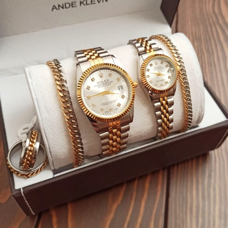 ست ساعت مردونه و زنونه رولکس Rolex نقره ای طلایی صفحه روشن با دستبند و انگشتر