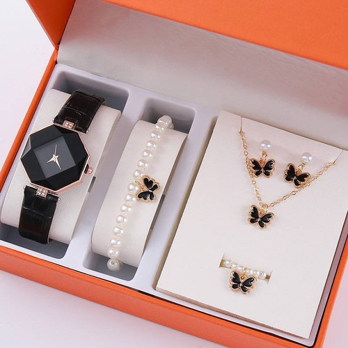 ست ساعت مچی دخترانه با دستبند گردنبند گوشواره و انگشتر پروانه ای